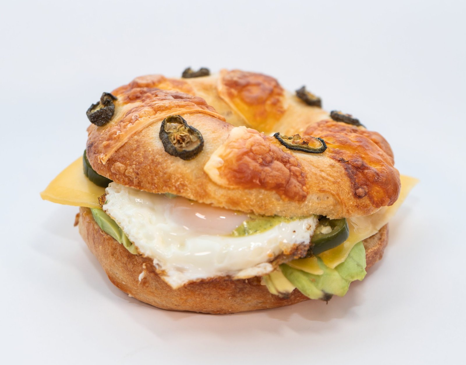 Bagel de jalapeño y queso, relleno de aguacate, queso, jalapeño y huevo.