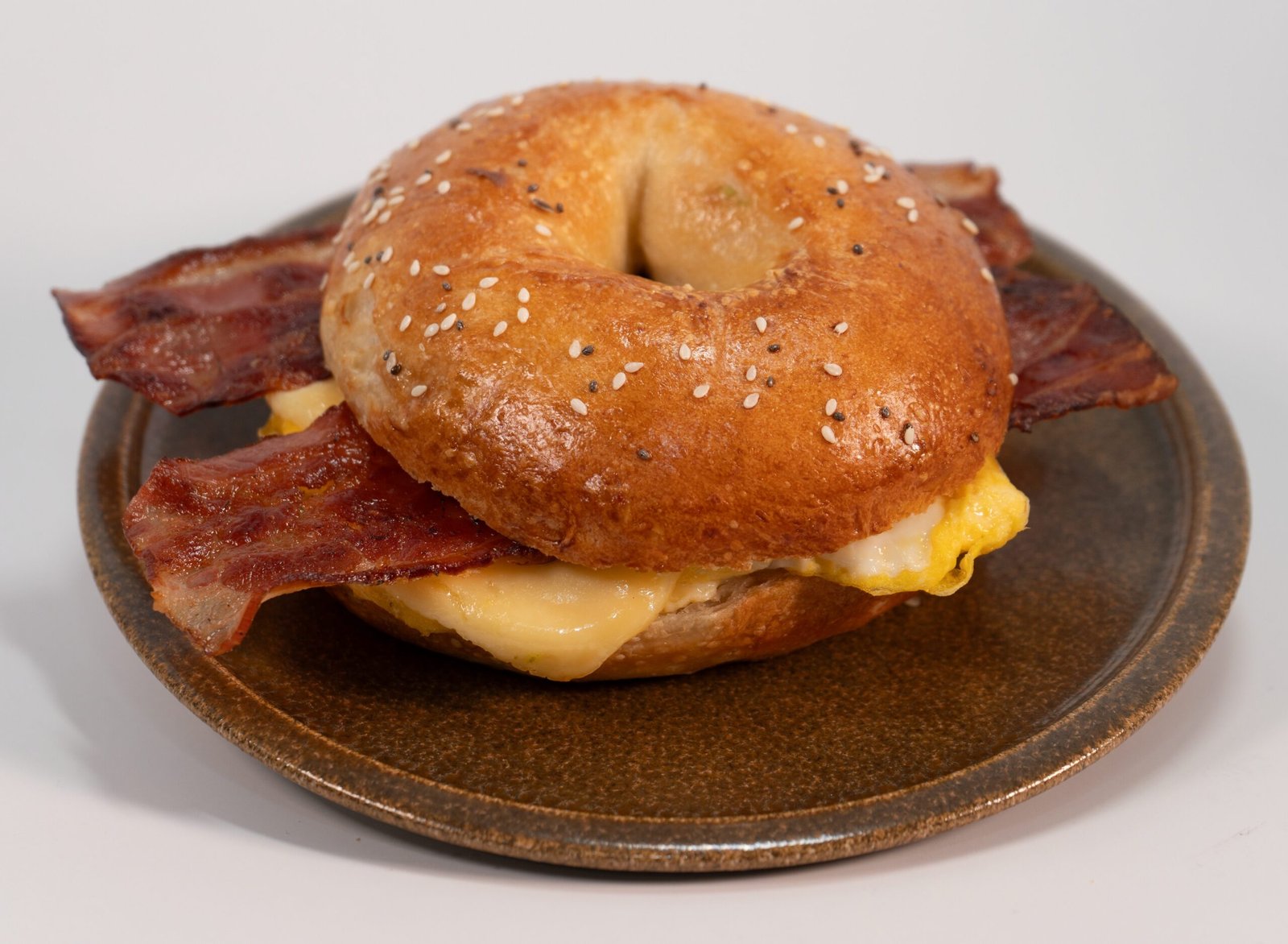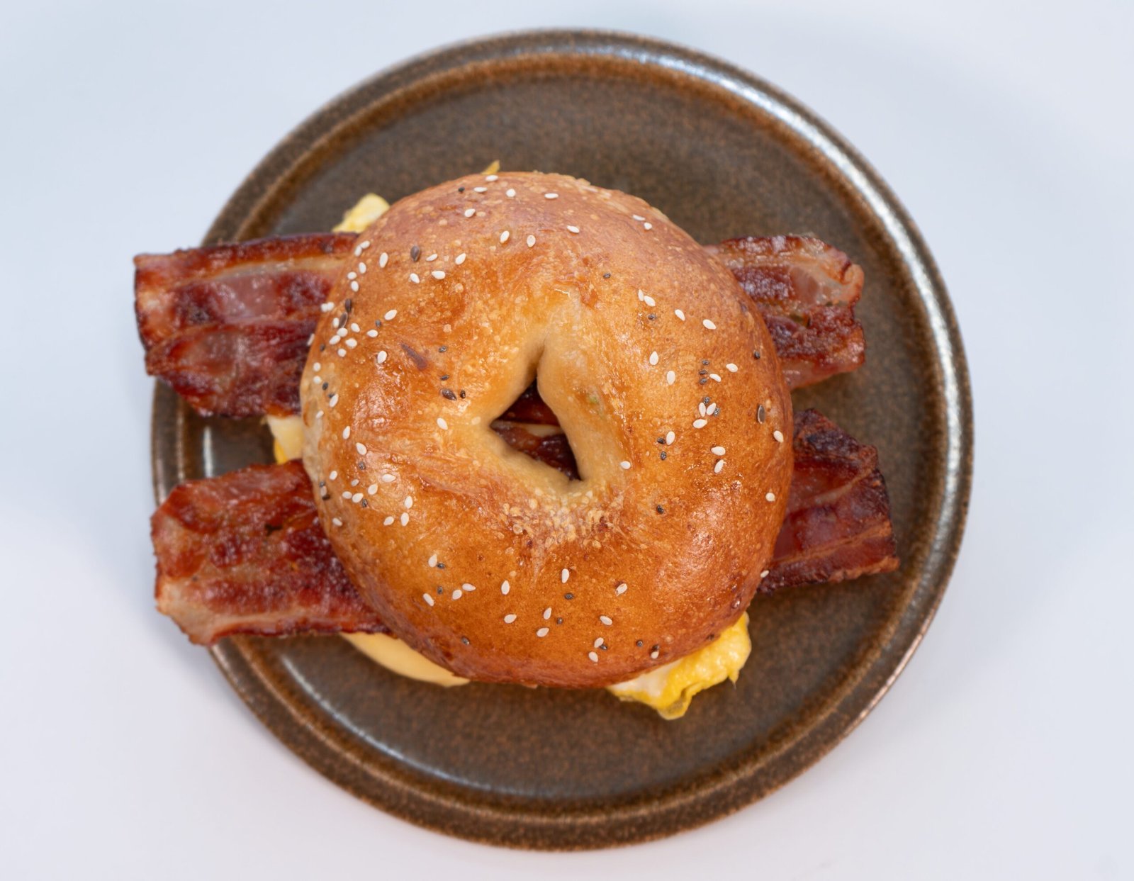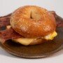 Bagel relleno de huevos, tocino y queso crema.